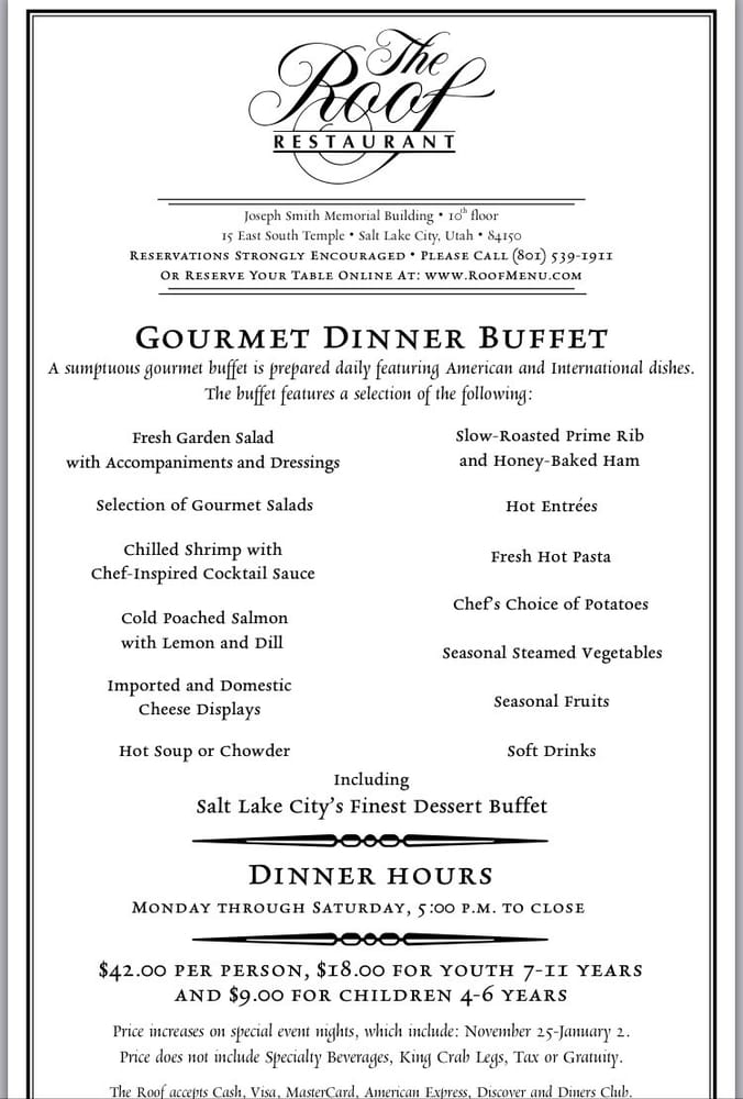 Introducing The Roof Restaurant, a New American buffet located in Salt Lake City, UT. This upscale eatery offers a breathtaking view of the city skyline, making it a perfect spot for a romantic dinner or special occasion. The menu features a variety of options, including snow crab legs, cooked shrimp, grilled fish, kielbasi, steak, brisket, and St. Louis ribs. Customers rave about the ambiance and live music, creating a truly unforgettable dining experience. While the price point may be on the higher end, the quality of the food and the impeccable service make it worth the splurge. Be sure to make reservations in advance, as this popular spot tends to fill up quickly, especially during the holiday season. Overall, The Roof Restaurant offers a unique dining experience that combines delicious cuisine with stunning views and exceptional service.